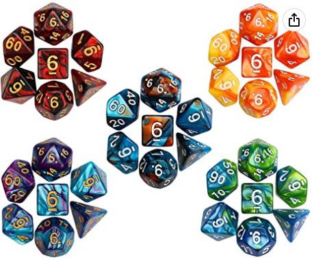 Dice set includes 7 pieces (20, 12, 10, 10, 8, 6, 4) there are multiple colors which will be chosen randomly.