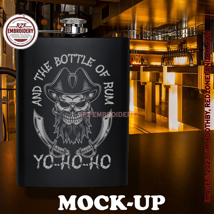 This is an 8oz black powder coated stainless steel flask with a laser-etched design.