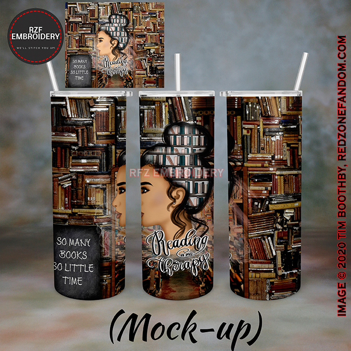 20 ounce stainless steel tumbler with sublimated with a library full of books with the saying “Reading is my Therapy” and “So many books, so little time”. These tumblers are double walled to keep beverages hot or cold for hours.