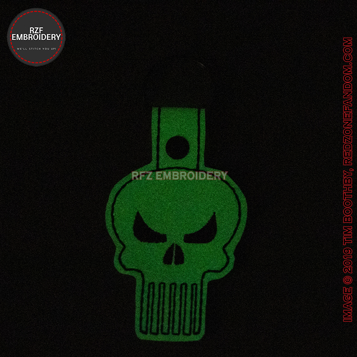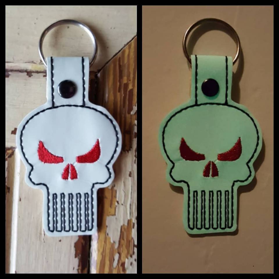Skull Keyfob is made with glow in the dark vinyl on the front and marine vinyl on the back. It is appx 2 inches x 4.5 inches.
