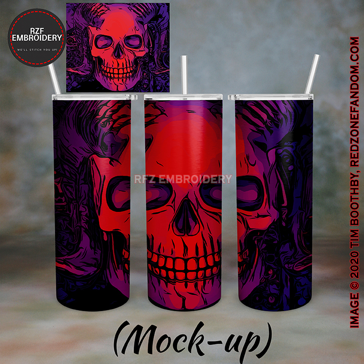 20 ounce stainless steel tumbler with sublimated with a red skull with purple highlights. These tumblers are double walled to keep beverages hot or cold for hours.