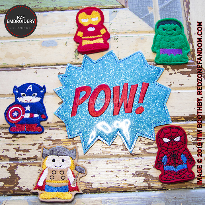 Pow Bag is appx 5.5 inches x 6 inches and is made from Glitter vinyl and felt. Puppets are made from felt and are appx 3 inches x 2 inches. There are 5 puppets and 1 Pow Bag in this set.