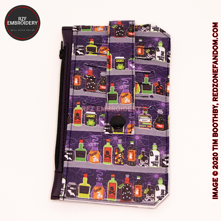 Wallet features potions on the front and a deep plumb vinyl back. Wallets are appx 7 inches long by 4 inches wide.