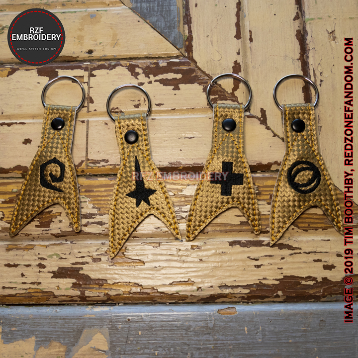 Star Trek Keyfobs are machine embroidered and hand cut. These are stock images, there could be slight color variations in the production line. We will update photos for any major changes. These Keyfobs are made with textured gold Marine Vinyl.