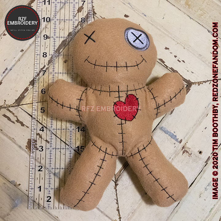 Voodoo Doll Stuffie is approximately 9.5 inches tall and 7 inches from outstretched hand to outstretched hand. They are made with fleece and stuffed with fiber fill.
